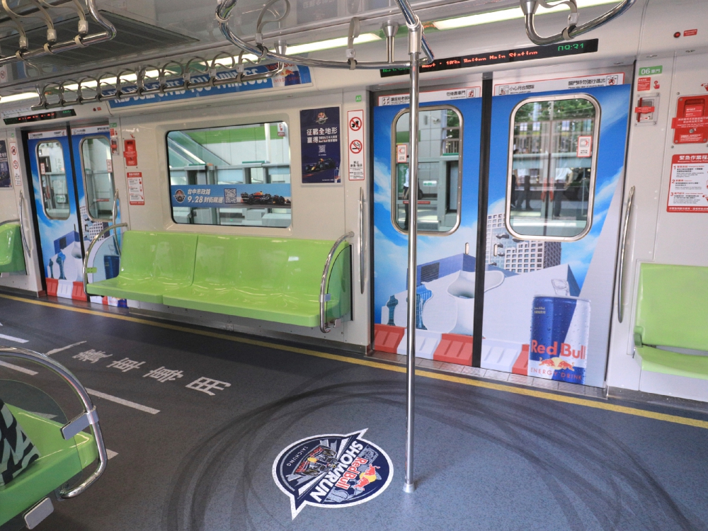 此外,車廂門呈現此次活動台中知名地標主視覺及紅白相間紐澤西護欄,更能完整感受賽道的真實體驗,窗貼則是Red bull賽車及本次活動的賽車手角田裕毅的肖像,讓賽車迷在搭乘捷運時提前感受活動的熱情。