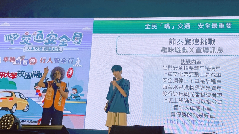 活動當日,除邀請時下大學生喜愛的藝人熱力開唱外,宣導小組也拿出渾身解數進行交通安全宣導。台中區監理所將現今最流行的「16蹲」舞蹈搭配交通安全月主題曲,吸引在場所有學生的目光,還準備豐富獎品邀請學生上台挑戰「全民嘴交通節奏變速遊戲」,一改過去靜態宣講,以RAP方式挑戰交通安全守則,同學們個個琅琅上口,用另類的嘻哈方式達到宣傳效果。