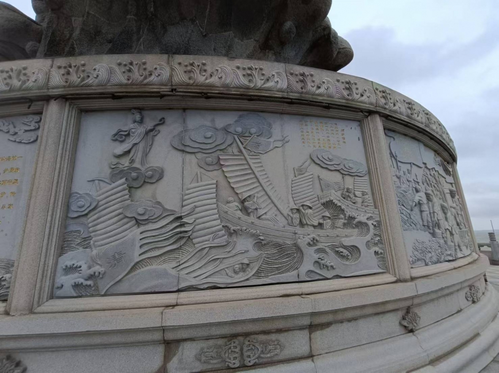 大陸天津濱海新區媽祖文化園區的媽祖聖像基座的四周共雕刻了14個,關於媽祖的故事傳說。(記者劉新維攝)