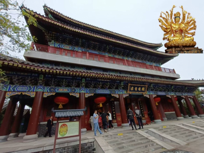 天津濱海媽祖文化園媽祖宮廟建築群內圓通自在廟所供奉的千手觀音像(右上角)。(記者劉新維攝) -