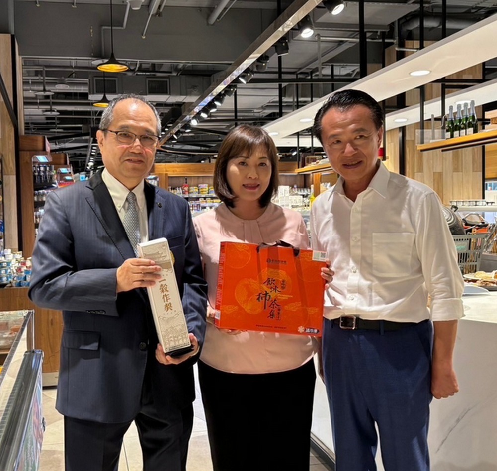 嘉義縣長翁章梁與微風超市總經理西川正史、番路鄉農會總幹事趙幸芳共同推廣特色農產。(圖/番路鄉農會提供)