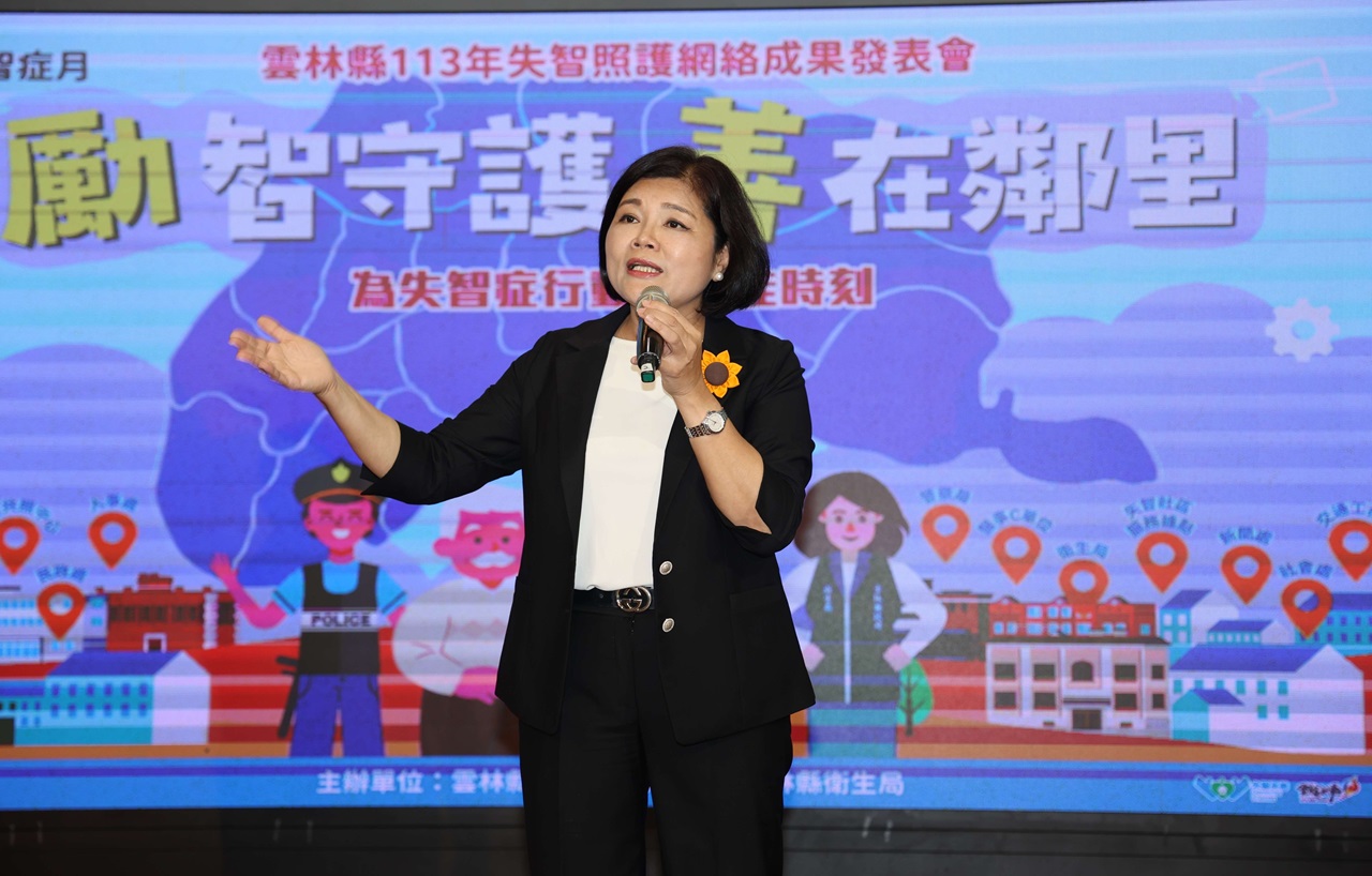 縣長張麗善表示,雲林縣自113年已進入超高齡社會化結構,推估失智人口更高達1萬1,849人,失智長輩非常需要大家關心、發現、預防。雲林縣政府為照護失智症患者及減輕失智症家庭照顧負荷,致力於建構失智社區安全照護網,制訂「雲林縣失智症防治照護行動計畫」,建立跨局處的分工合作。112年計畫成果包含社會處獨居或失智長者智慧防護網絡服務(共核定1,155人次)、警察局防走失指紋捺印服務(共363件)、教育處國中小認識失智課程(共123所學校)、衛生局與各局處合作辦理失智識能宣導(共1,252場次)、努力營造失智友善社區(共2處鄉鎮市)及招募失智友善天使(共2,481位)等,同時亦建置5處失智共照中心、24處失智社區服務據點、6處家庭照顧者支持性服務據點及4處失智團體家屋與日照中心等,完成每鄉鎮皆有失智照護網路的布建。