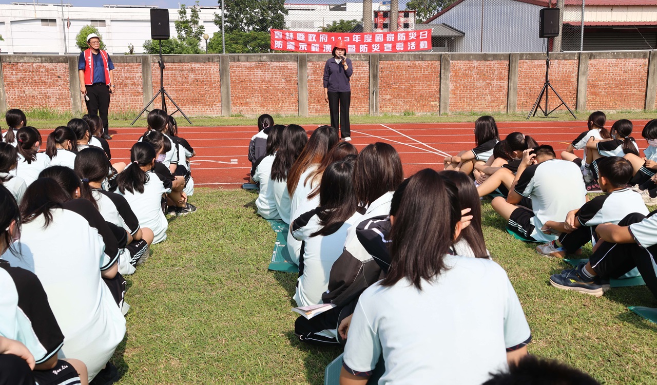 張麗善縣長與師生一起演練地震應變避難,提升全民防災知能與意識。
