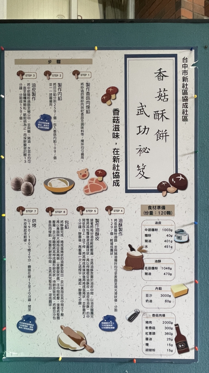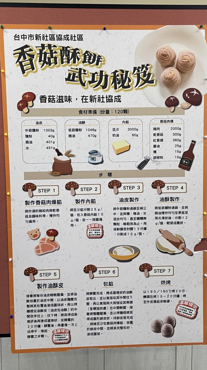 農業局表示,新社為全國香菇主要產地,在協成社區內的協中街素有香菇街美名,遊客可在此選購品質優良的香菇產品,為推廣社區香菇產業及研發社區特色伴手禮,透過辦理香菇產業體驗營,讓大眾認識香菇製品的多元變化。