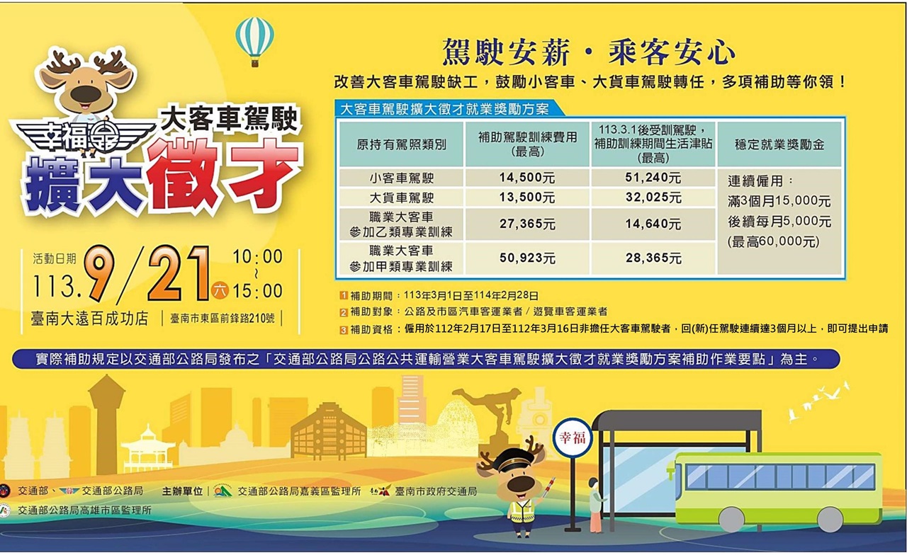 嘉義區監理所將於9月21日(星期六)上午10時至下午3時,在臺南大遠百成功店前廣場舉辦「2024大客車駕駛擴大徵才活動」。(記者蘇榮泉翻攝)