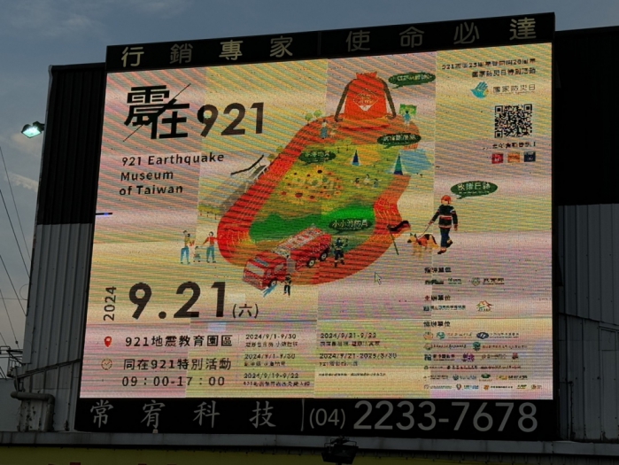 【記者廖本福臺中報導】921震災25週年活動將於9月21日在國立自然科學博物館921地震教育園區隆重展開。台中市政府消防局表示,該活動將以各項防災活動及攤位市集宣導正確防災觀念,常宥科技有限公司得知後主動協助宣傳,分別於中清交流道口、崇德路/松竹路口及文心路/中清路口等3處進行LED戶外媒體廣告輪播,邀請民眾踴躍參加,學習防災知識。
