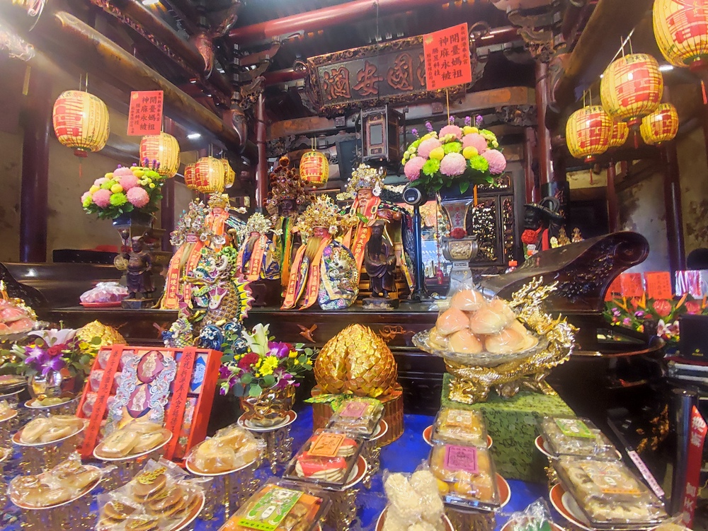 新港奉天宮契子女祈福團拜也正逢土地公生日準備豐富特色祭品。(圖/記者任芳葵攝)。