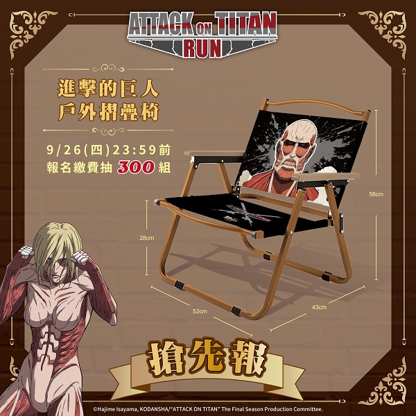 【9/26(四)23:59前】報名繳費就抽300組「進擊的巨人戶外摺疊椅」,各場次各抽300組!