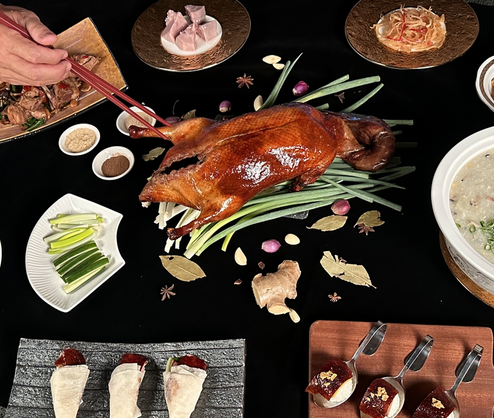 賀采宴會廳表示,這隻美味烤鴨,費盡餐飲團隊心思,嚴選櫻桃鴨、精心準備陳皮、八角等中藥材,再加以手工磨粉,透過醃製讓中藥材香氣融入,透過掛爐烘烤,費時3天才能端上桌。