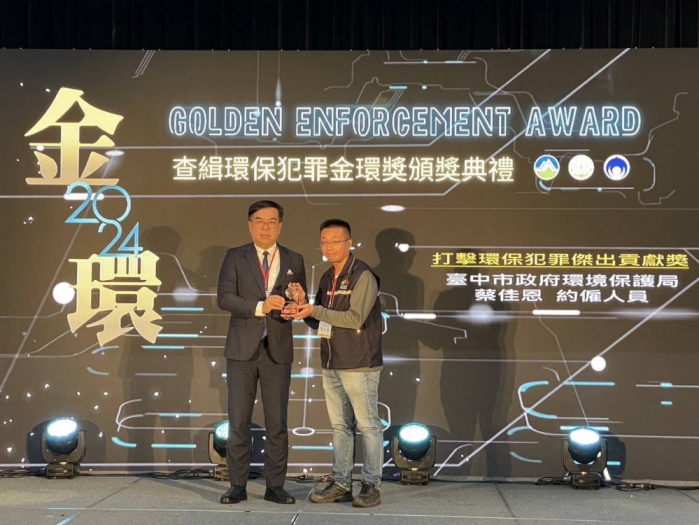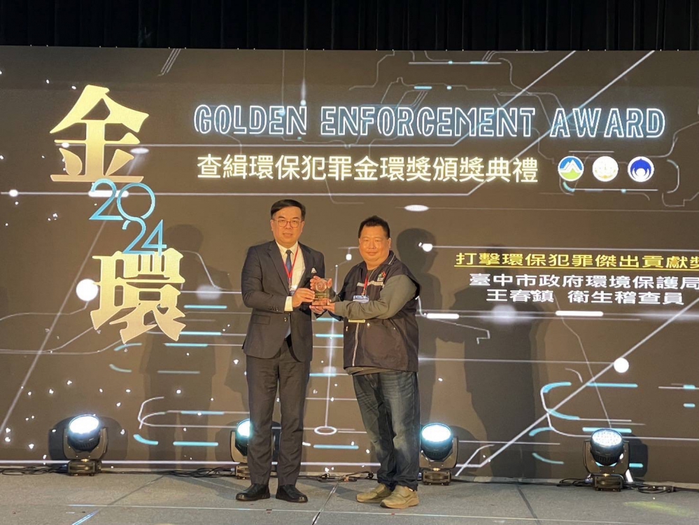 環保局長陳宏益說明,金環獎為環境部授予全國查緝環保犯罪第一線執法績優人員的最高榮譽,此次環保局環境稽查大隊2位同仁獲得個人獎的殊榮,分別為111年10月間破獲不肖業者於清水區土地挖坑傾倒廢酸洗液,及112年3月於烏日區番仔園圳溝假借槽車載運水肥名義偷排廢切削液的同仁。