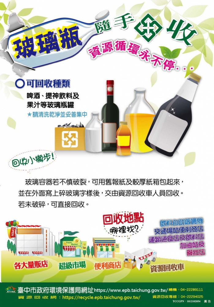 南屯區清潔隊隊長陳秀玲表示,飲料玻璃瓶常被棄置在路邊、公園,甚至抛丟到農田裏,造成農民農忙時受到傷害或不便。民眾回收玻璃瓶時,請注意分開回收小心交給隨車人員,另外也可以交由各大量販店、超級市場、便利商店、連鎖速食店、加油站及藥粧店等販賣點回收。