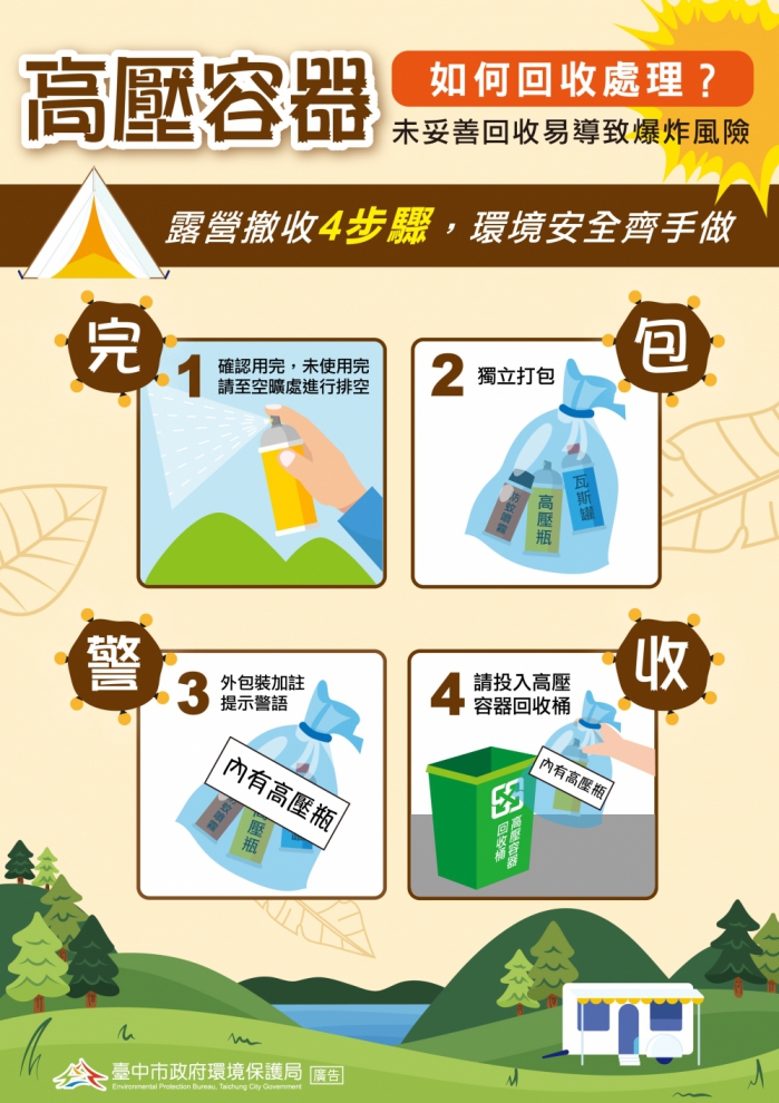 此外,用過的瓦斯罐、造型噴霧、殺蟲劑、噴漆罐皆屬於高壓容器瓶,回收前做好4步驟,包含一、完-請先排空內容物;二、包-單獨打包成一袋;三、警-加註標示警語;四、收-再交給資源回收車回收,千萬不要丟入垃圾車,以免垃圾車壓縮引起炸爆、起火,危害清潔隊員或傷害到倒垃圾的民眾。另也歡迎民眾參加此次兌換活動,回收兌換前,請排空內容物。
