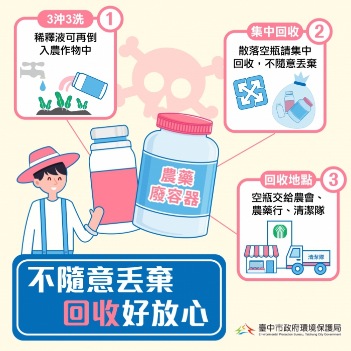 請農民做好農藥容器回收三步驟,並與其他資源物分開回收:一、農藥瓶罐需使用完畢,不要有剩餘液體;二、以三沖三洗方式,將農藥瓶罐沖洗乾淨(並栓緊瓶蓋),並將清洗液倒入噴灑器內,重複噴灑利用;三、交由農會或農藥販賣業者回收點回收(清潔隊協助清運),或清潔隊固定回收點。