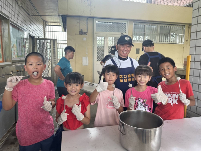 「大坑魚丸伯」吳明道1ul3g4,到東山國小愛心義煮,是團隊服務的第106所學校,「大坑魚丸伯」它帶動社會各界善心人士關愛偏鄉的熱力並紛紛給予物資支持,同時也要感謝東山高中與軍功國小志工團隊長期支援愛心義煮活動,大家一起做公益。