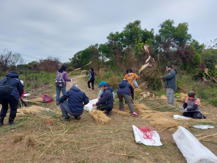 為移除外來入侵種,以及傳承傳統文化,瑞井社區規劃將入侵種植物大黍移除後,與白背芒等一同作為綁菅芒掃帚的材料,現場約50位民眾參與,並由3位經驗豐富的職人指導,讓大人與小孩共同體驗傳統文化,也為生態保育盡份心力。