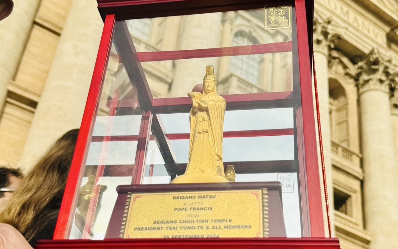 【記者蘇榮泉/雲林報導】北港朝天宮慶祝建廟330週年,董事長蔡咏鍀與中華民國宗教與和平協進會一同於9月25日造訪梵蒂岡,正式拜會教宗方濟各,促進國際宗教間的交流與合作。蔡董事長此行特別敬備一尊象徵媽祖慈悲的金媽祖神像,獻予教宗作為紀念,兩位宗教領袖進行了多次友善互動,藉此象徵媽祖信仰與天主教的跨宗教友誼,促進不同文化與信仰之間的溝通與理解。