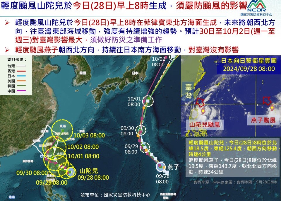 第18號颱風山陀兒將於10月1日至2日最接近台灣,雲林縣政府正密切注意颱風動態,並呼籲民眾做好防颱準備。(圖/翻攝自國家災害防救科技中心)