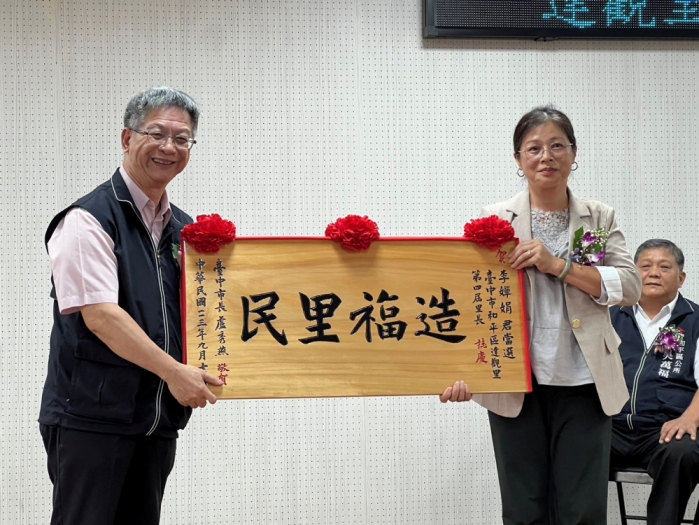 就職典禮30日在和平區公所舉行,由民政局副局長歐陽明代表市長盧秀燕頒發當選證書、印信,並致送「造福里民」賀匾,祝賀達觀里新任里長李嬋娟就職。