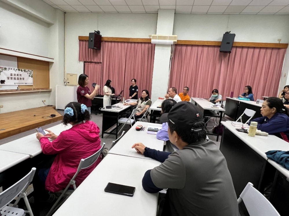 研習課程邀請生物多樣性研究所陳元龍主任、野聲環境生態有限公司郭彥仁研究員等講師,分別介紹黑熊救傷及照護、黑熊族群現況與友善黑熊策略、環教課程、公民科學-iNaturalist(愛自然)操作,培訓種子教師建立正確黑熊保育觀念,辨識黑熊痕跡、避免黑熊滋擾處置方式、人熊相遇處置,並減少廚餘及飼料避免吸引黑熊等方法,增能黑熊環境教育解說工作,後續運用於鼓勵社區部落、大眾參與保育,如何友善黑熊避免受人類行為影響,減緩人熊衝突的保育推廣與解說。讓參與研習課程的志工們到校推廣時,教案課程內容多元又生動。