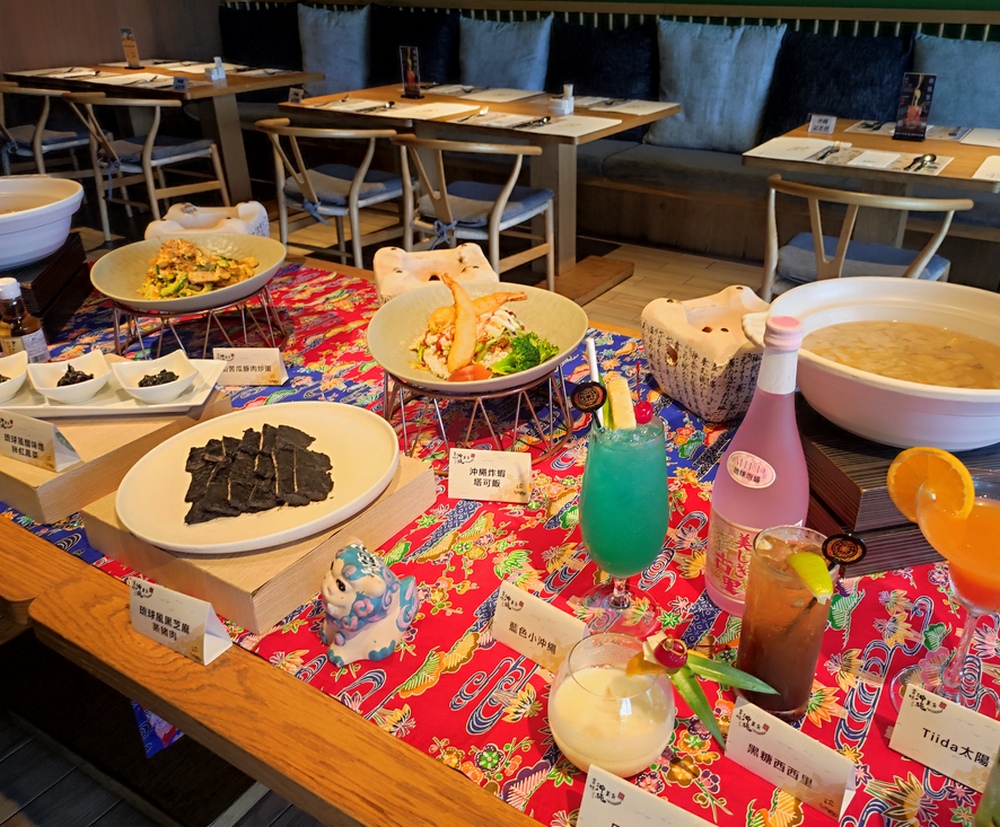 餐廳精心佈置獨具沖繩風格的花布、招福獅等,帶您徜徉熱情洋溢的沖繩美食文化。大廳酒廊調酒師更特別向沖繩調酒專家請益,以沖繩傳統蒸餾酒「泡盛」為基底,推出系列泡盛主題調酒,泡盛以其香醇的風味和獨特的蒸餾工藝著稱,並結合多種水果、椰子利口酒及苦瓜,推出「日落海灘」、「Tiida太陽」以及最具沖繩代表性的雞尾酒「58 Kacha-sea」,也有沖繩盛產的黑糖跟Espresso調製的「黑糖西西里」無酒精飲品,邀請一起試試琉球的獨特風味。