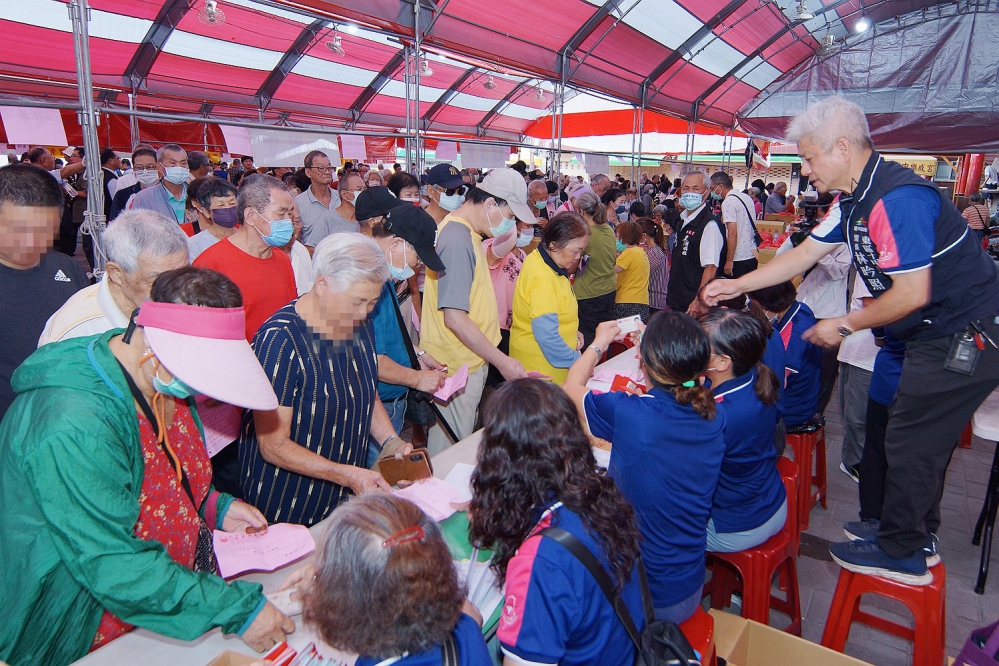 【記者林獻元台中報導】旱溪八里長者真幸福。台中樂成宮秉持「老吾老以及人之老」宏揚敬老文化,感恩長者過去對家庭、社會、國家的貢獻,功不可滅,沒有他們過去的努力,就沒有後代子孫的豐衣足食,7日上午於樂成宮廟埕發放重陽敬老金,人數高達5470人,禮金發送7438200元,並送每位長者代表長壽的平安麵線一包。