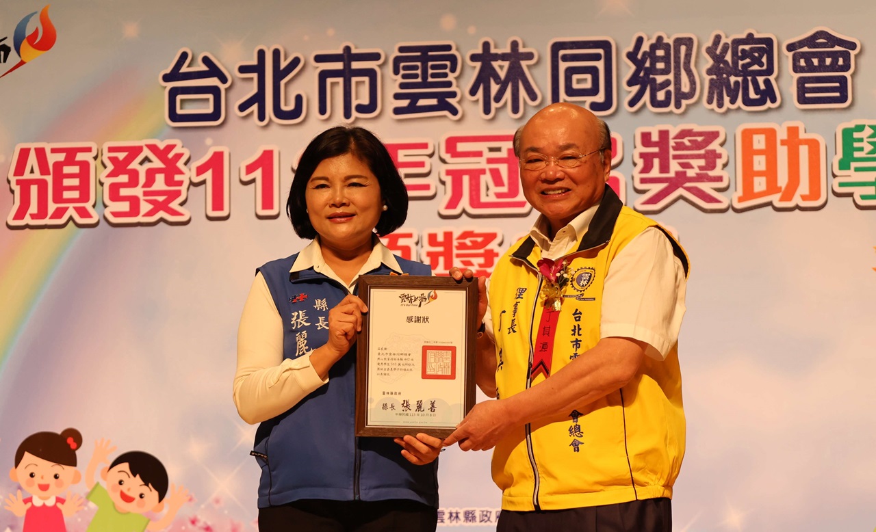 張麗善縣長表示,台北市雲林同鄉總會冠名獎助學金由同鄉會前理事長洪宗錄發起,迄今共有1,590位學子受惠,總計達1272萬元獎助金。今年由理事長丁其源等62位捐款人發起募集353萬6000元,捐助給62校442位清寒學生。期許每個孩子能獲得鼓勵與幫助,未來有能力能夠效法前輩,回饋社會。