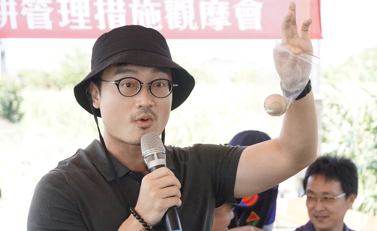 吉田田有限公司專員鄭佳豪說明赤眼卵寄生蜂的應用,透過寄生蜂控制玉米螟的蔓延,達到有效減少農藥使用,保護農田生態的目的。(圖/記者蘇榮泉攝)