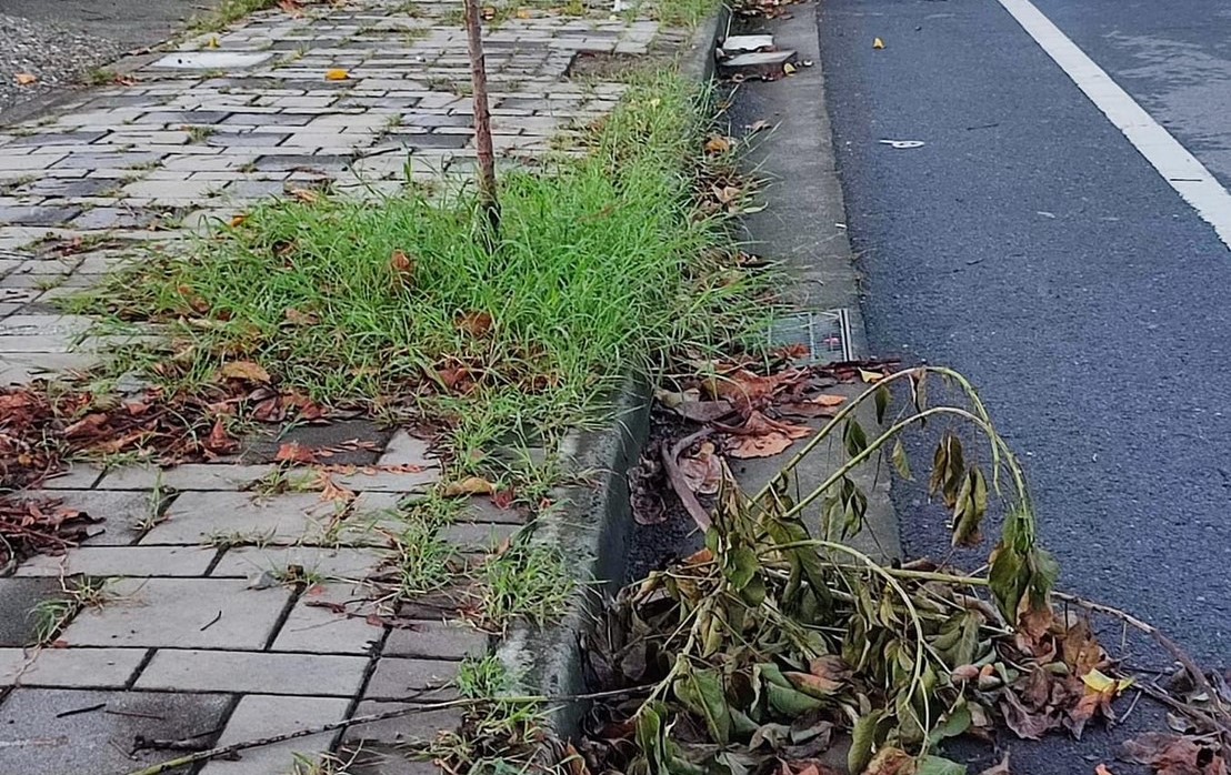 北港鎮太平路、北港農工校區及運動公園等地區清潔打掃前枯樹葉及雜草叢生。