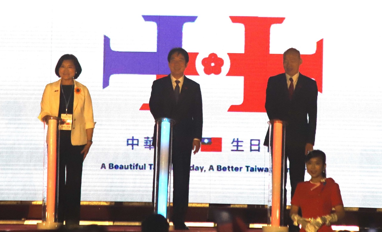 雲林縣長張麗善(左起)、總統賴清德、立法院長韓國瑜共同啟動國慶焰火。