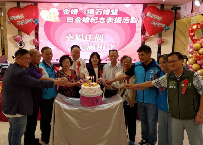 【記者陳榮昌外埔報導】台中市外埔區公所為弘揚夫妻白頭偕老及敬老崇孝之美德,於十二日上午在后里區東達極品美饌餐廳舉辦金婚、鑽石婚暨白金婚紀念表揚活動」,到場接受公開表揚之鑽石婚夫妻九對、金婚夫妻四十五對,計五十四對伉儷接受表揚及祝福。