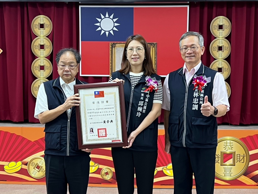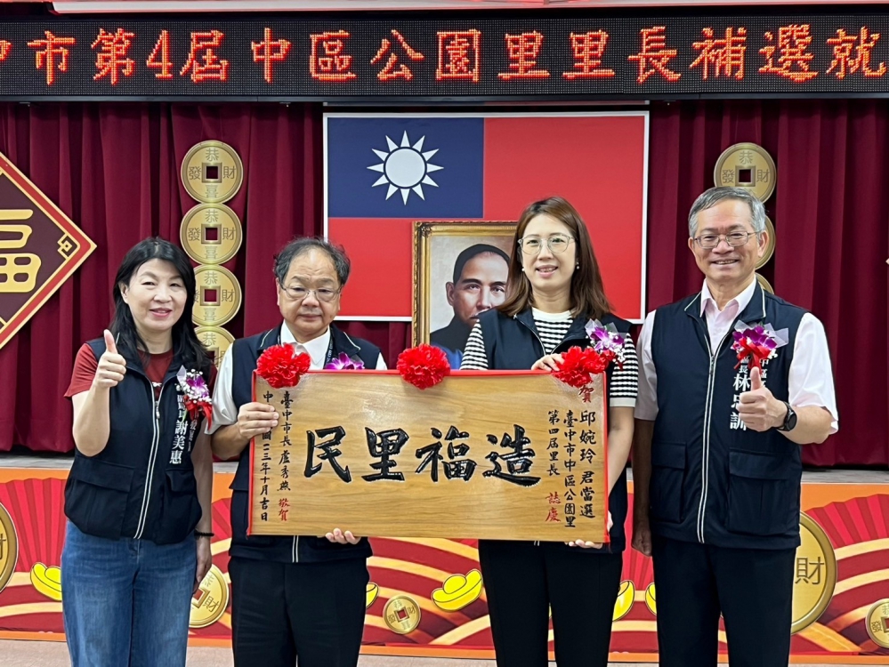 【記者林獻元台中報導】台中市中區前公園里長陳裕明因個人因素,於今年8月1日辭去里長職務,台中市選舉委員會10月5日進行補選投票,由陳前里長妻子邱婉玲以486票大勝對手利麗芳450票。就職典禮16日在中區區公所舉行,中市府民政局長吳世瑋頒發當選證書並致送「造福里民」賀匾,祝賀公園里新任里長邱婉玲就職。