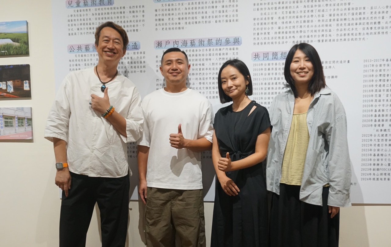藝術家黃啟軒(左2)、蔡佳吟(右3)雙人聯展於虎科大展出,藝術中心主任李彥希(左1)於開幕現場共同合影。(圖/記者蘇榮泉攝)