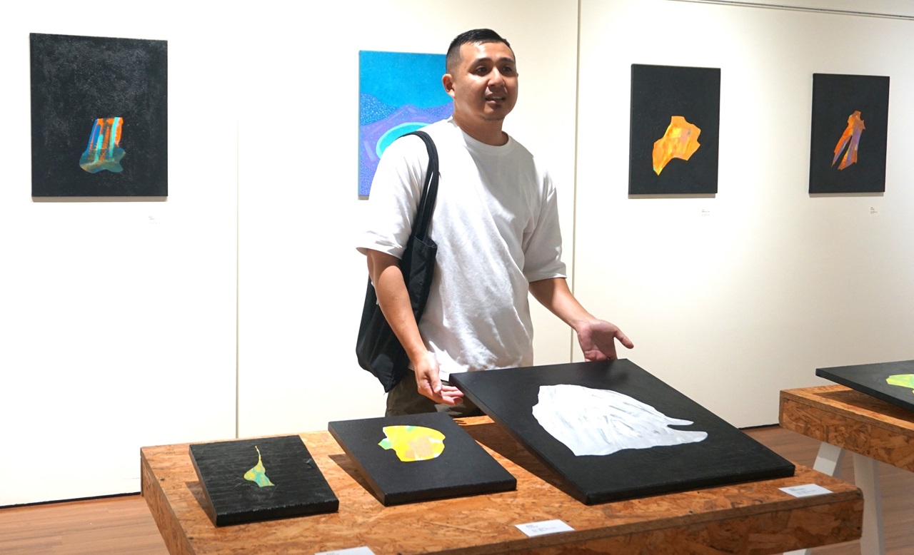 藝術家黃啟軒的個人系列作品〈那些戀的片段〉,作品中彩色與黑色顏料交織,展現出想忘卻過去但也想留住美好記憶的情感拉扯。(圖/記者蘇榮泉攝)虎科大副校長莊為群也在展覽開幕時鼓勵學生觀展,並希望藝術作品能融入學生生活,激發他們對生活的不同見解。此次展覽共展出68件多元形式的作品,包含公共藝術、靜態攝影、繪畫等,自即日起至11月8日在虎科大第二校區展覽室展出,歡迎各界參觀。
