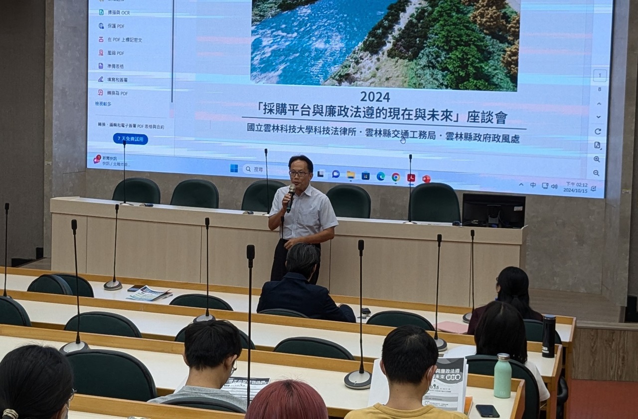 【記者蘇峰毅/雲林報導】由國立雲林科技大學科技法律所、雲林縣交通工務局及雲林縣政府政風處聯合主辦的2024年「採購平台與廉政法遵的現在與未來」研討會,於10月15日在國立雲林科技大學成功舉行。本次研討會聚焦於當前採購平台的運作與廉政法遵的挑戰,吸引了多位學者及實務專家參與,展開一場關於政府採購與法治問題的深度對話。