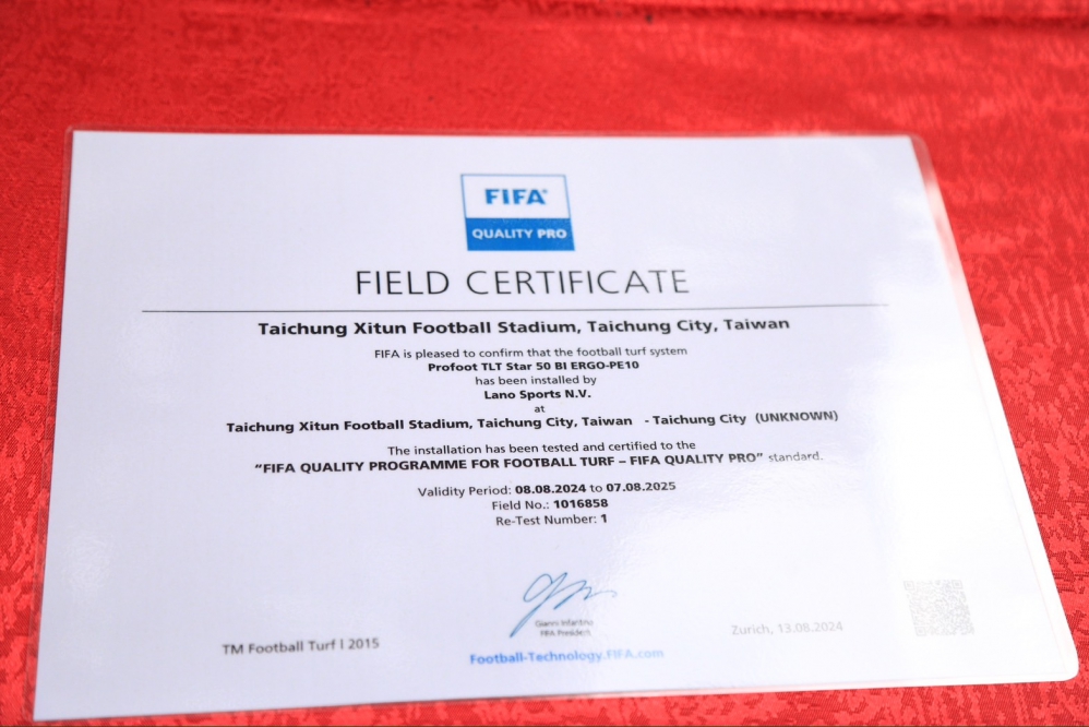 FIFA認證的球場共有三個等級,而此次啟用的西屯足球場屬於最高的Pro級,象徵世界級的專業性能。該球場不僅完成滾球、避震、穩定性等六項嚴格測試,更具備舉辦國際賽事的能力,是台中第一座經FIFA國際認證,且全台第一座採用天然軟木塞顆粒的無毒環保球場。