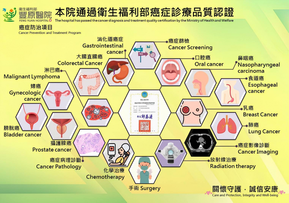 若確診為癌症,無需恐慌,豐原醫院具備完善的癌症治療資源,涵蓋大腸直腸癌、肝癌、乳癌、肺癌、子宮頸癌及其他多種常見癌別。專業的癌症醫療團隊將根據病人的病況,提供包括外科手術、介入性治療、癌症藥物治療(如化療、荷爾蒙、標靶治療等)以及放射線治療等多樣化選項,並且在治療後持續提供追蹤與照護,守護每一位病患的健康。