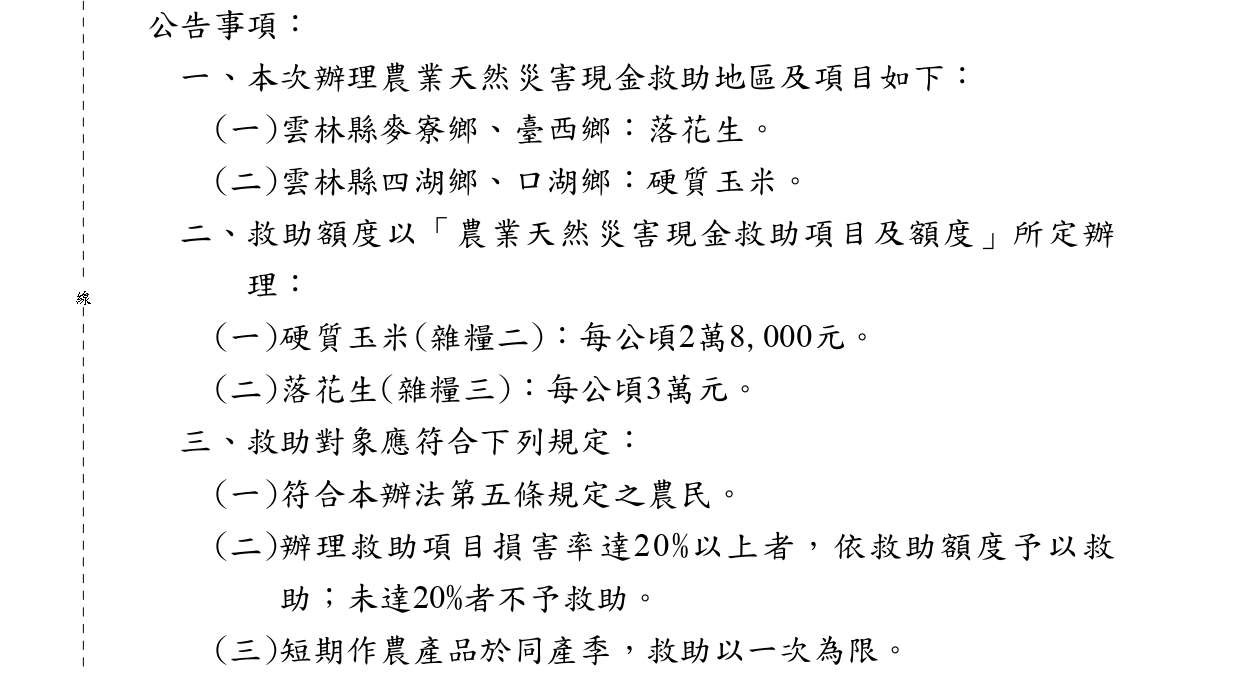 【記者蘇峰毅/雲林報導】雲林縣沿海地區因受山陀兒颱風影響,雖無降雨,但強烈乾風造成部分農作物受損,尤其是落花生和硬質玉米。縣政府接獲農民通報後,縣長張麗善立即指示農業處展開四方會勘,並迅速向農業部申請農業天然災害現金救助。農業部於10月15日正式公告,麥寮鄉、臺西鄉、四湖鄉及口湖鄉的落花生與硬質玉米符合救助標準,農民可自10月16日起至10月29日向所在地公所申請現金救助。