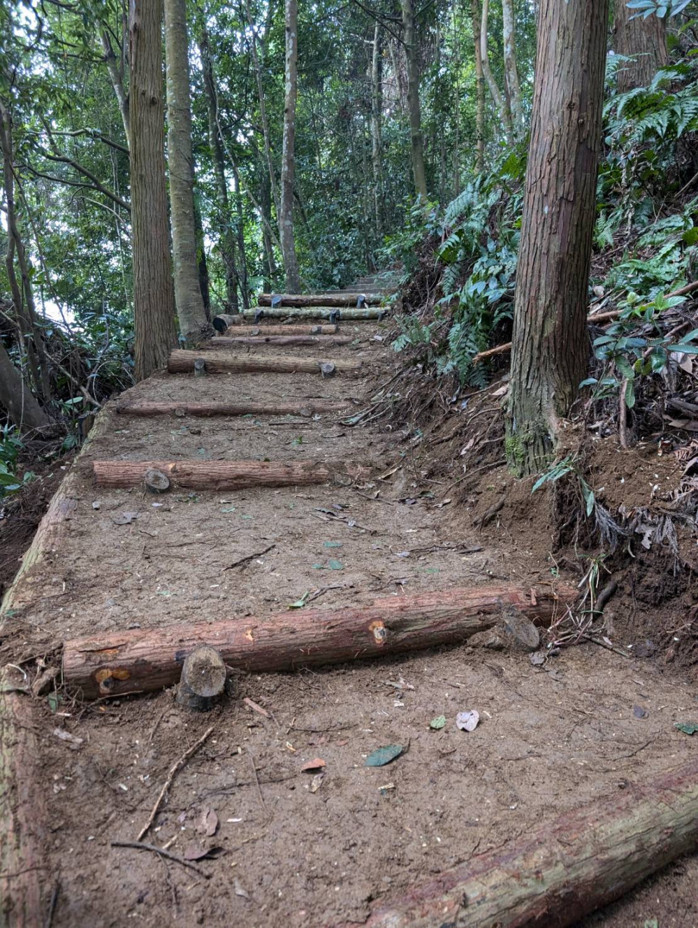 為改善橫嶺山步道上樹根裸露的狀況,志工們尋找合適的枯、倒木,裁切成合適的尺寸,於浮根步道上構築成階梯,以保護裸露的樹根,再搜集土壤填滿夯實,過程就像蜜蜂般來回不停地穿梭在森林裡,流的都不知是汗還是淚了。