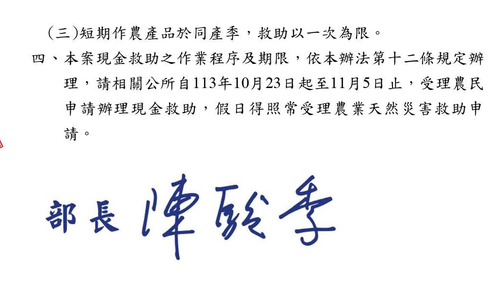 農民可自10月23日起至11月5日止,向土地所在地的鄉公所申請現金救助。