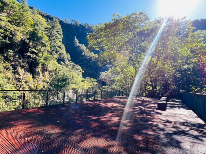 平台上可一覽十文溪的自然景色,聆聽淙淙水聲,為園區必訪的拍照景點,除了視野遼闊,也適合進行伸展、靜坐、吸收瀑布負離子,讓身心靈充分放鬆,是園區進行森林療癒體驗的重要場域。