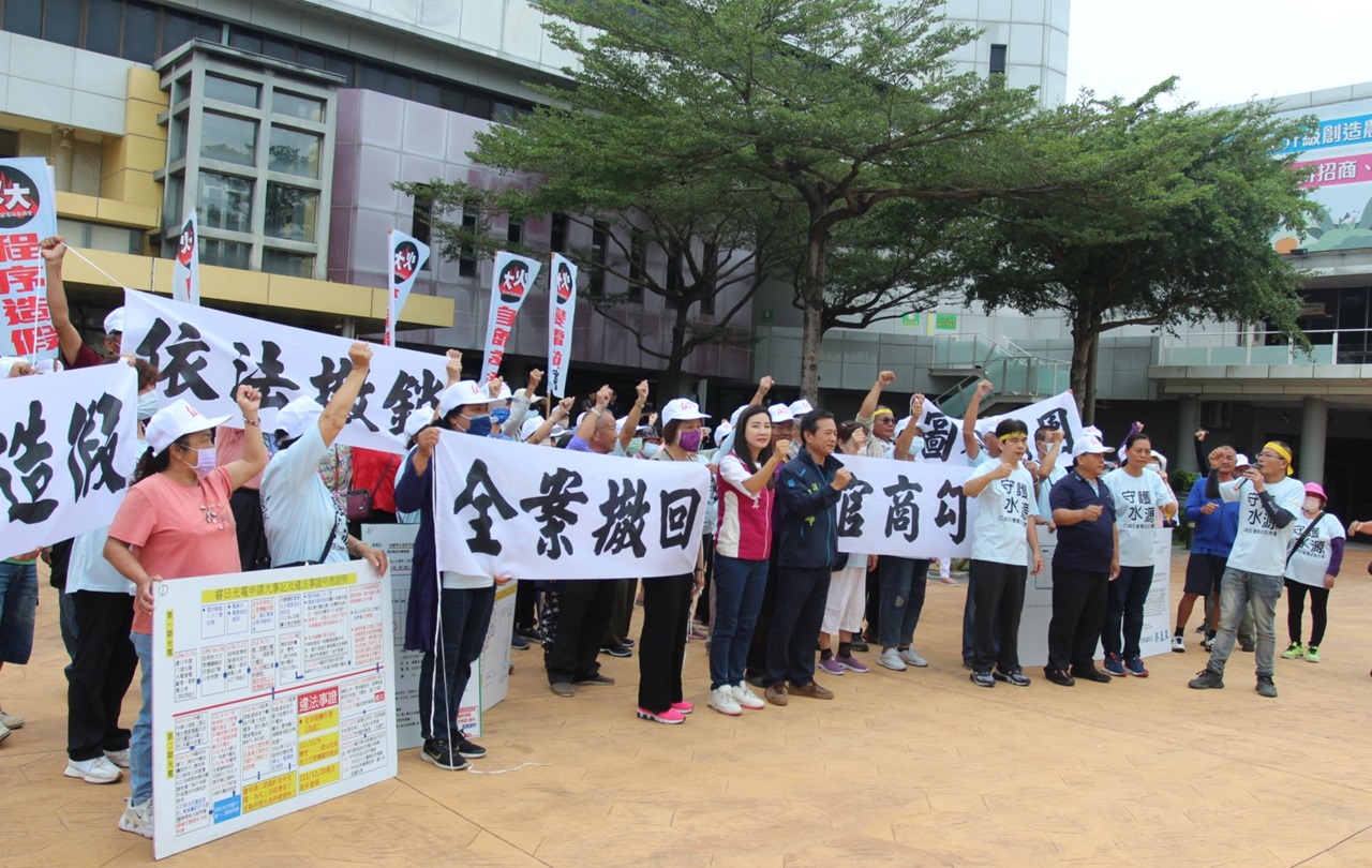 口湖反變電站自救會成員於今(28)日在雲林縣政府前集結,抗議縣府涉嫌與睿日光電勾結,非法核發變電站同意函。(記者蘇榮泉攝)
