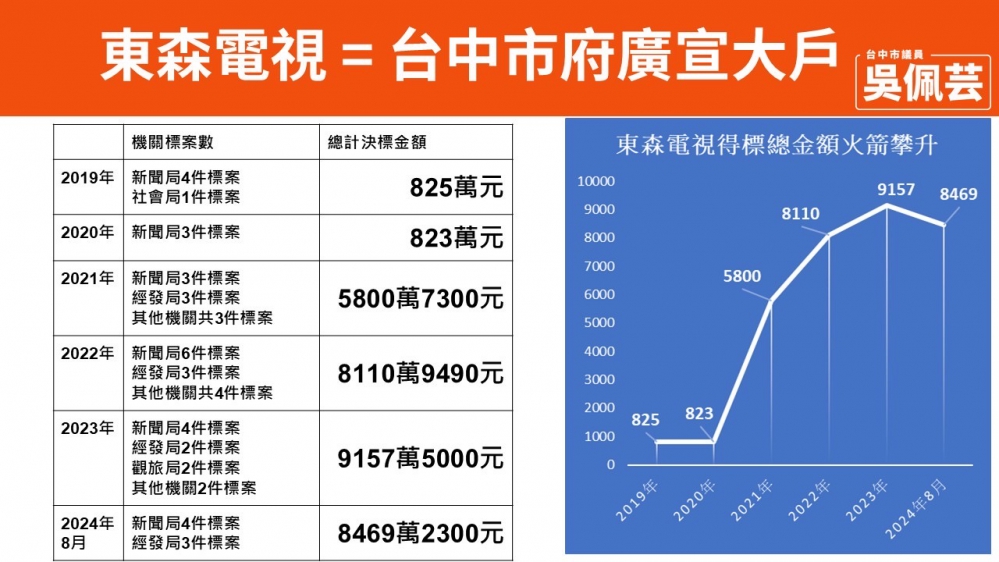 吳佩芸強調,東森電視在2019年自臺中市政府新聞局、社會局共取得825萬元標案,2021年開始自新聞局、經濟發展局取得5800萬餘元標案,甚至2022年到2024年每年得標總金額都是近億元規模。