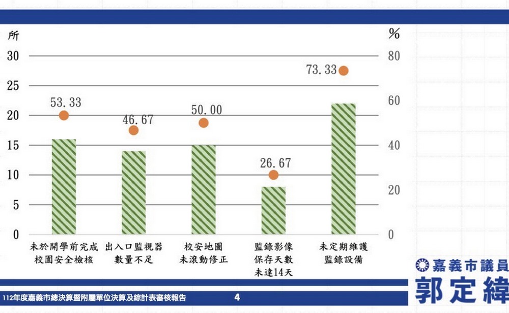 郭定緯議員根據審計部112年度嘉義市決算報告中點出,郭定緯也質疑嘉義市的校園安全網根本不夠緊密,他提及審計部112年度決算報告中,嘉義市國中小學校遭點名「學校環境安全防護工作及校安事件處理尚有精進空間」,其中53.33%的學校未於開學前完成校園安全檢核,46.67%的學校出入口監視器不足,50%校安地圖未滾動調整,26.67%監視影像保存天數未達14天,還有高達73.33%的學校沒有定期維護監錄設備,讓郭定緯批教育處缺乏危機意識,「偷拍集團都入侵校園了,竟不重視校安檢核。」