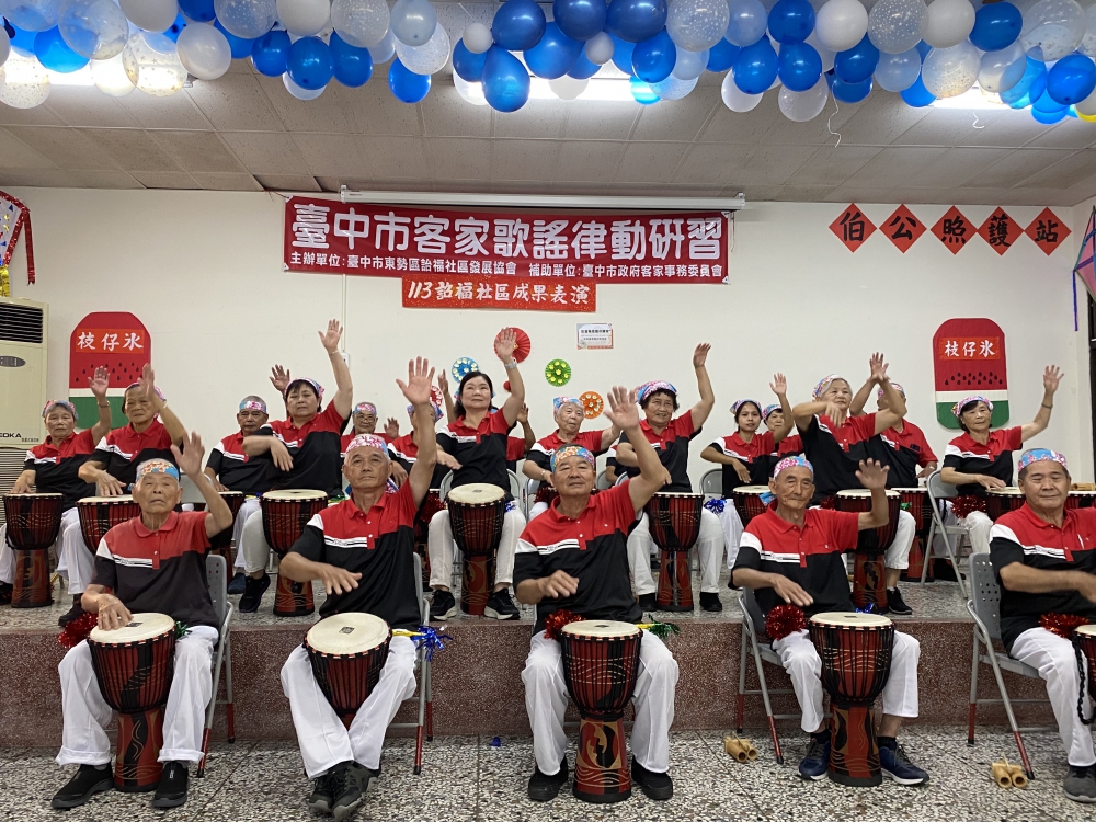 在成果發表會上,社區長輩展現平日課程所學,帶來多首客家經典歌曲歡唱,串連鄰近各里共同展演。詒福社區帶來精彩的手鼓演出、同舍日照帶來身心障礙朋友辛苦學成的木箱鼓帶動唱、下城社區以原住民樂舞表演、上城與泰昌社區的客家舞蹈、東勢農會樂齡學習中心展現精采舞藝,最後活動的高潮,是各個社區伯公照護站長輩大合唱,為成果展劃下完美句點。