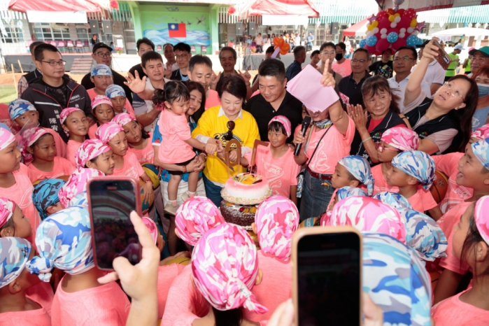 【記者楊川欽台中報導】台中市烏日區溪尾國小9日舉行70周年校慶,為感謝市府推動「小黃公車」接駁孩童到校,特別舉行「跟著小黃25社區」路跑活動,別開生面的校慶儀式吸引許多家長帶著孩子參加。台中市長盧秀燕日前收到全校60名學童連署製作的校慶邀請函十分感動,百忙中特地趕赴學校與師生同慶切蛋糕,現場更拿出邀請卡逐一念出學童親筆手寫的注音字句,向師生表達感謝,祝福溪尾國小生日快樂。