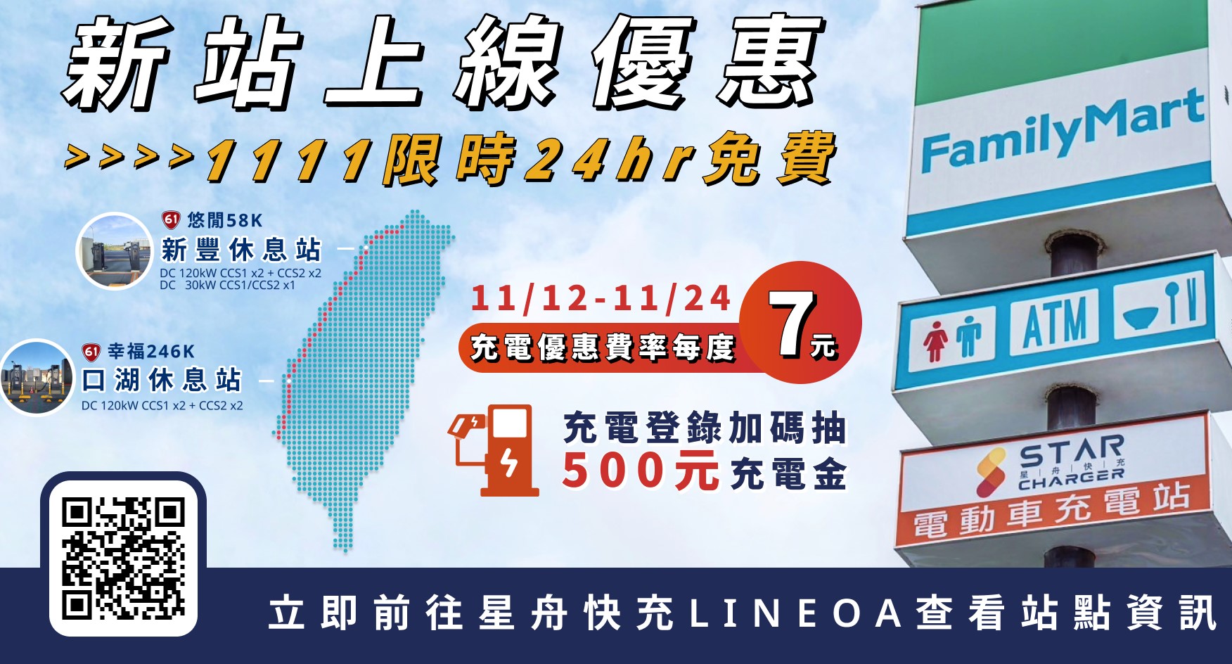 11月22日,星舟快充還將於新豐及口湖休息站舉行「站點快閃」活動,屆時將贈送充電金與萬元全家Fa點,讓使用者體驗充電新科技的便利與高效。星舟快充承諾,將持續提供從充電站建設到設備維修的「一站式充電解決方案」,並與多家企業合作,共同實現綠能普及化,為台灣電動車主打造無縫的充電體驗。