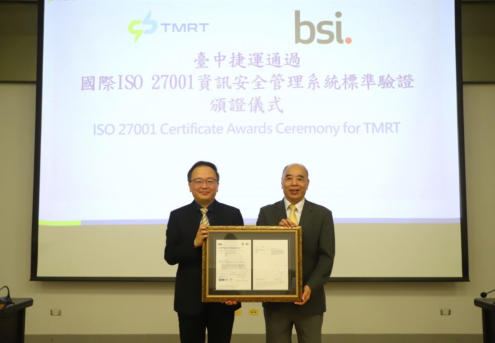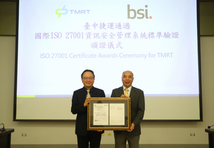 【記者林獻元台中報導】台中捷運公司致力於強化資訊安全管理,今年8月通過英國標準協會(British Standards Institute,簡稱BSI) 國際「ISO 27001:2022資訊安全管理系統」驗證,13日舉行授證儀式,由BSI營運長謝君豪將證書授予中捷公司董事長顏邦傑。顏邦傑表示,通過驗證代表中捷資訊安全管理達到國際標準,未來將持續精進,更加提升服務品質。