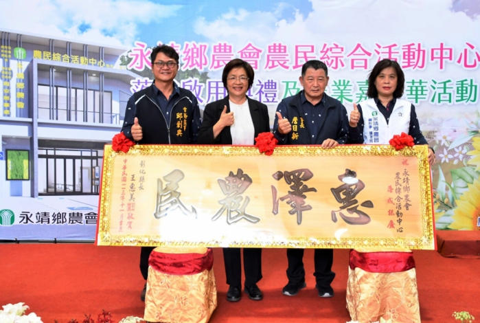 永靖農會農民綜合活動中心落成,農會以辦喜事心情慶祝,並舉辦農業嘉年華,縣長王惠美、農會理事長詹日新、常監邱創典、總幹事陳翠玲和立委陳素月、謝衣鳳等各級民代與會剪綵,王縣長贈﹁惠澤農民﹂匾額祝賀,王縣長表示,活動中心去年八月動工,今天落成,盼望20多年的活動中心,終於實現,感謝農會理事長詹日新、常監邱創典、總幹事陳翠玲用心協調,取得土地興建,完成後可省下500~600萬元租金,感謝農業部支持,提供農民展示和農民福利活動空間,成為永靖在地新地標。