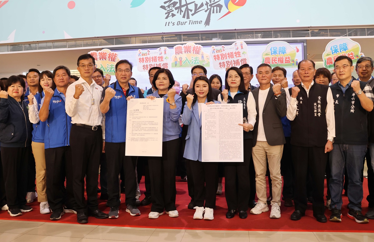 【記者蘇峯毅/雲林報導】為爭取農業權入法,雲林縣長張麗善今(19)日上午在多位議員、農會總幹事及公所代表的支持及見證下,於雲林縣政府親民大廳向張嘉郡、丁學忠、許宇甄三立委遞交「國土計畫法增修農業權入法」的公文書,張麗善強烈表達爭取農地的公平正義,期盼立委們能在立院協助推動農業權入法,對農地農用進行補償。