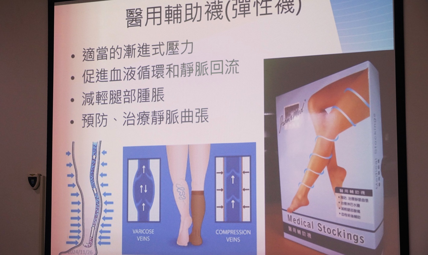 當有靜脈曲張之症狀如靜脈鼓漲或水腫,建議穿著醫用輔助襪(即彈性襪)可有效改善症狀和延緩靜脈曲張進展,適合的壓力範圍為20至30毫米汞柱。(圖/記者蘇峯毅攝)